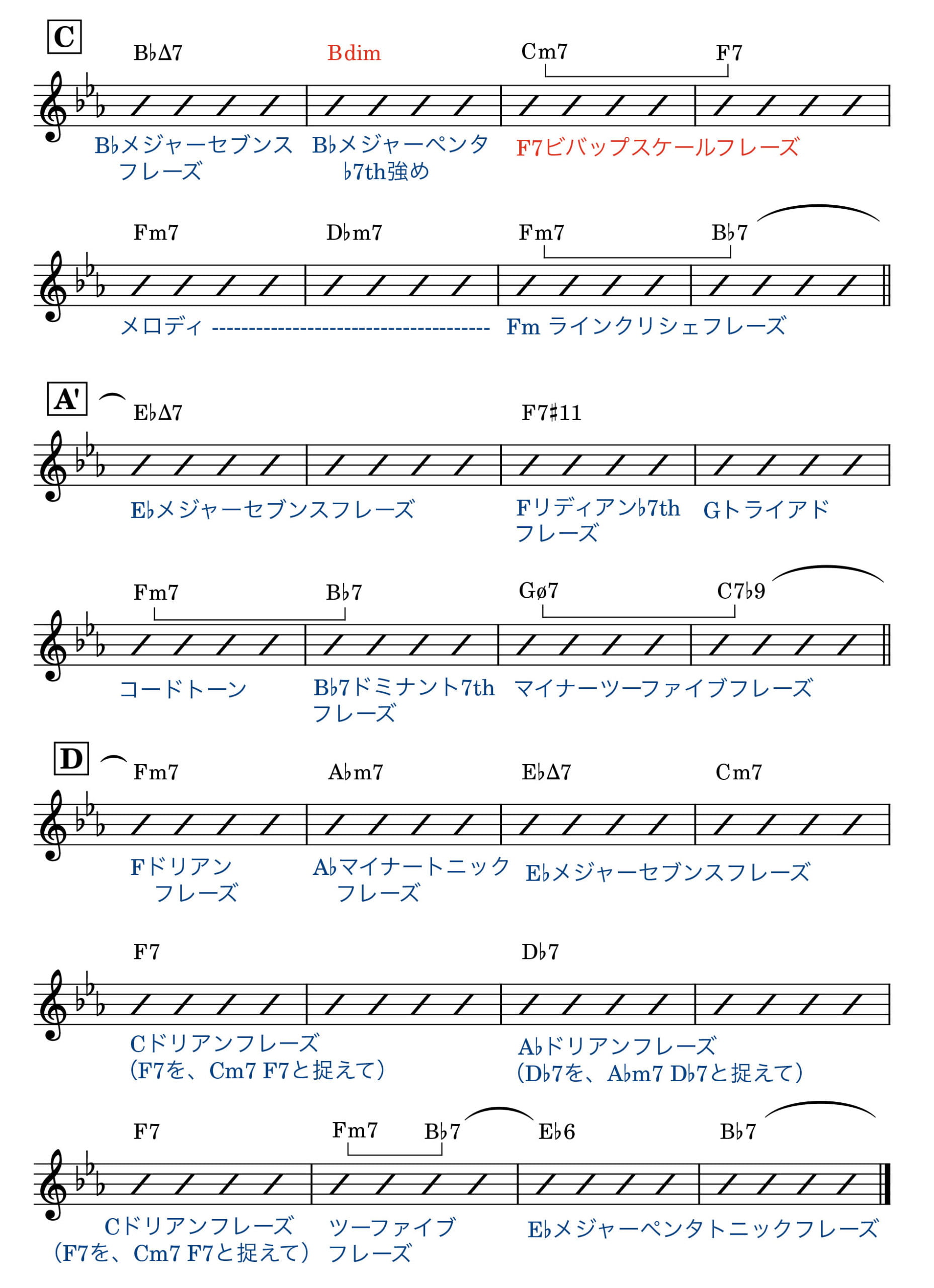ドリアンフレーズと表記しているところは「ツーファイブフレーズの1小節目の部分を演奏しているイメージ」です。例)B♭m7 に対して、B♭ドリアンフレーズ → B♭m7 E♭7 のツーファイブフレーズの1小節目